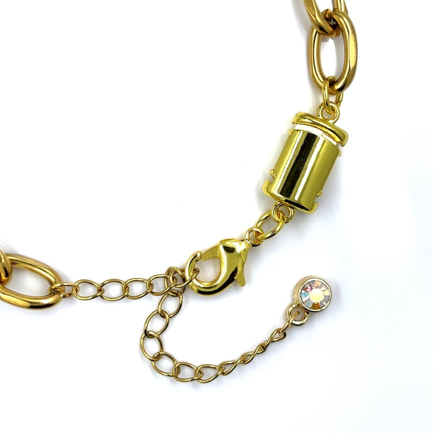 This bracelet features a gold-plated cable chain adorned with an eye-popping teal and gold bead. Perfect for those who value both aesthetics and convenience, this adjustable bracelet showcases our patented Freedom Clasp, making it the easiest jewelry clasp in the world. Say goodbye to the struggle of fastening your jewelry and embrace effortless elegance.