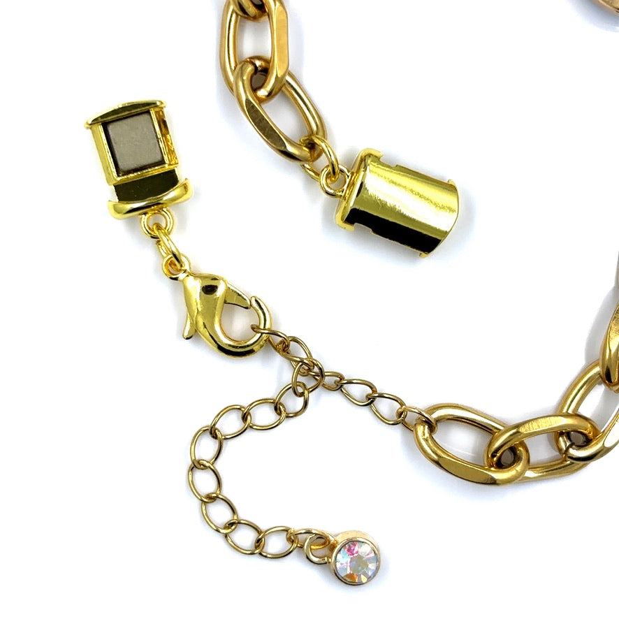 We only use non-magnetic extender chain, so it will not stick to the Freedom Clasp. Unlike other adjustable bracelets, you can make your adjustments with the lobster claw prior to wearing your bracelet, rather than struggling to find the perfect fit while on your wrist.